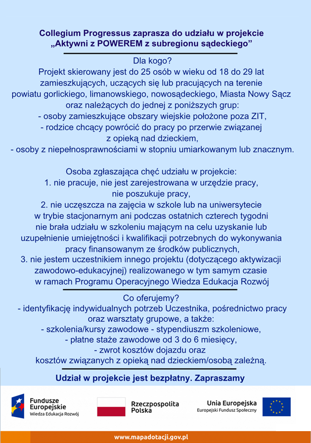 Fundacja Collegium Progressus na terenie powiatów: nowosądeckiego, limanowskiego, gorlickiego oraz Miasta Nowego Sącza realizuje obecnie projekt pn.: „Aktywni z POWEREM z subregionu sądeckiego”.