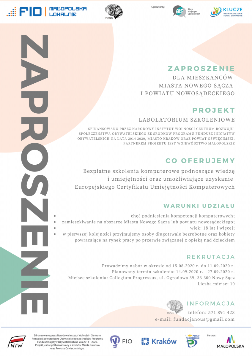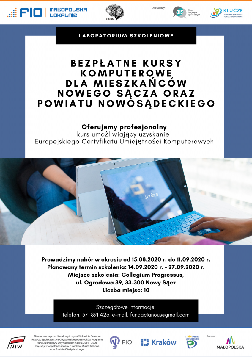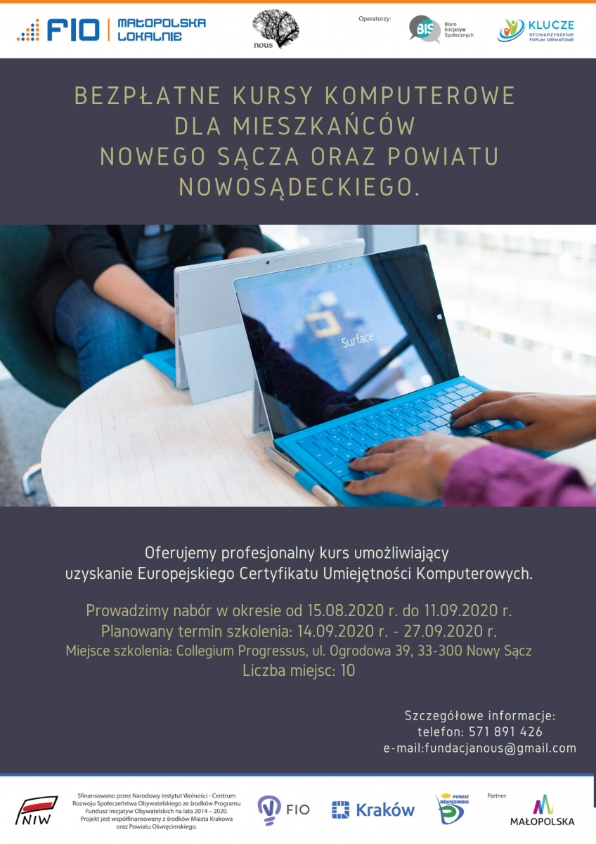 Informujemy, iż od 15 sierpnia 2020 r. rozpoczynamy rekrutację na Bezpłatne Kursy Komputerowe dla mieszkańców Nowego Sącza oraz powiatu nowosądeckiego. Liczba miejsc ograniczona.