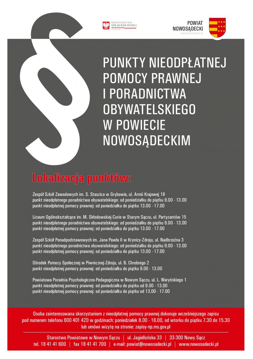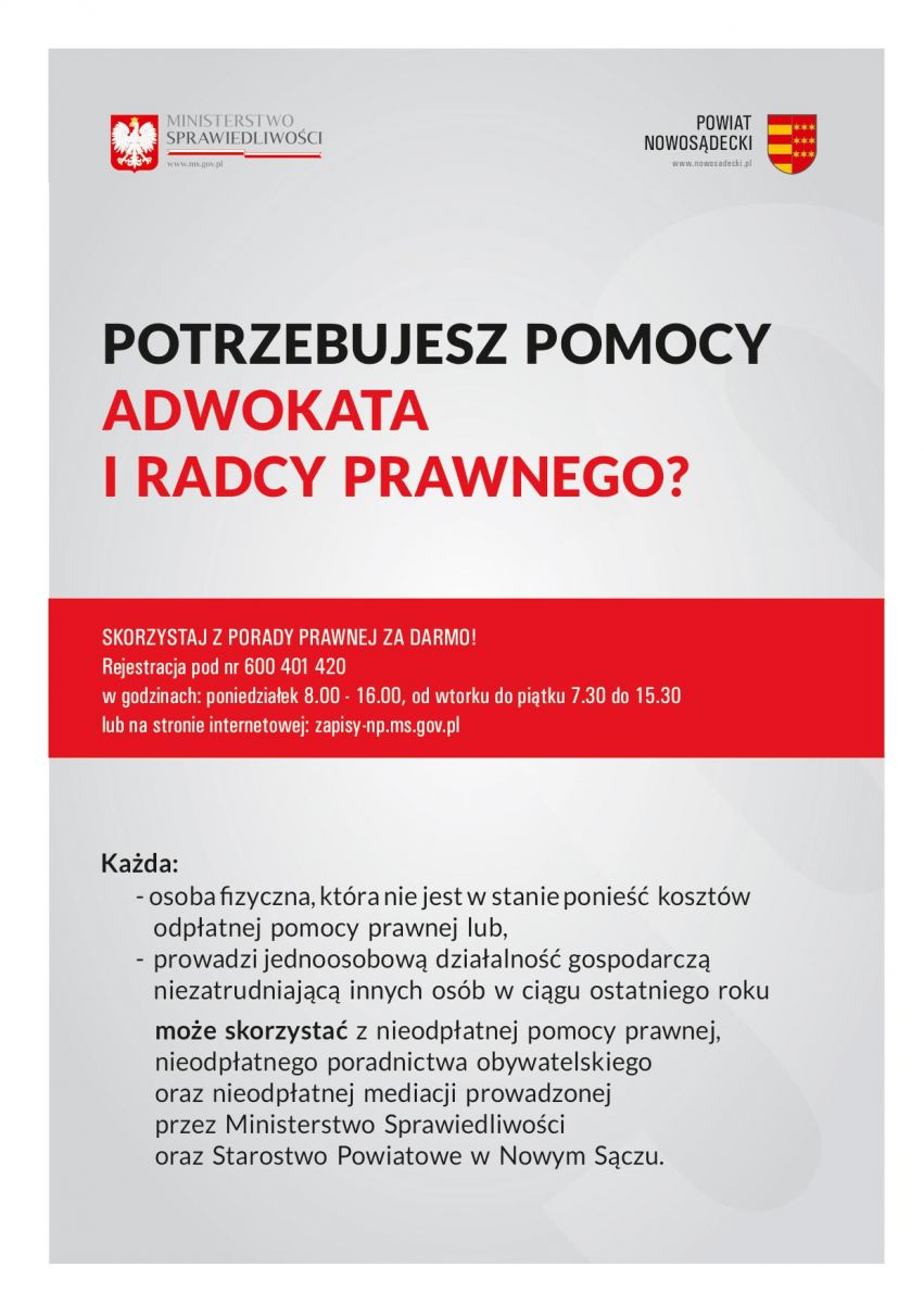 W związku z pismem Starosty Nowosądeckiego Ośrodek Pomocy Społecznej w Korzennej informuje o możliwości skorzystania z nieodpłatnej pomocy prawnej, nieodpłatnym poradnictwie obywatelskim oraz edukacji prawnej.