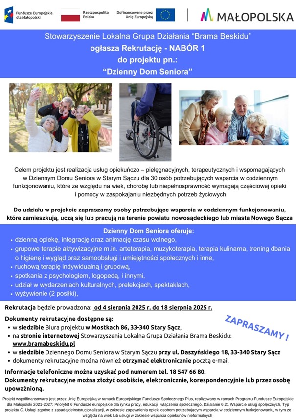 Stowarzyszenie Lokalna Grupa Działania „Brama Beskidu” ogłasza rekrutację do projektu pn. „Dzienny Dom Seniora”.