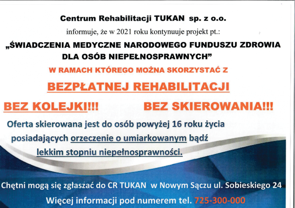 Centrum Rehabilitacji TUKAN sp. z o.o., informuje o kontynuacji w roku 2021 projektu "Świadczenia Medyczne Narodowego Funduszu Zdrowia dla osób niepełnosprawnych. Szczegóły i informacja, poniżej: