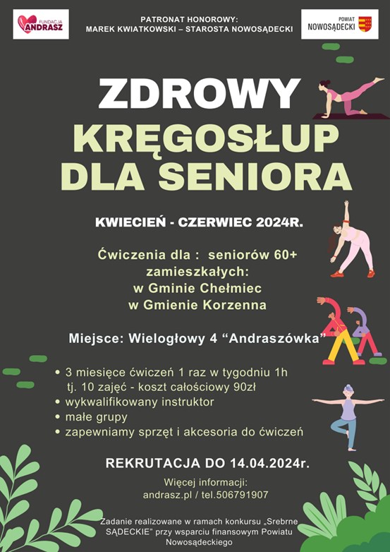 Fundacja „Andrasz", zaprasza seniorów w wieku 60+, zamieszkujących Gminę Chełmiec, Gminę Korzenna do programu „Zdrowy Kręgosłup dla Seniora”.