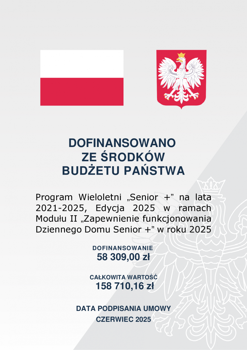Dotacja jest przeznaczona na dofinansowanie zadania polegającego na zapewnieniu funkcjonowania ośrodka wsparcia dla osób starszych w zakresie ustalonym w programie wieloletnim „Senior +” na lata 2021 – 2025, Edycja 2025 w ramach Modułu II „Zapewnienie funkcjonowania Dziennego Domu Senior +” w roku 2025.
