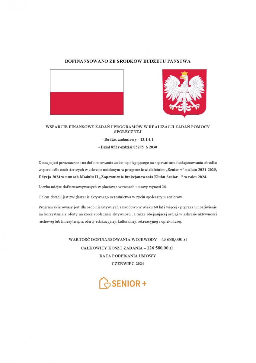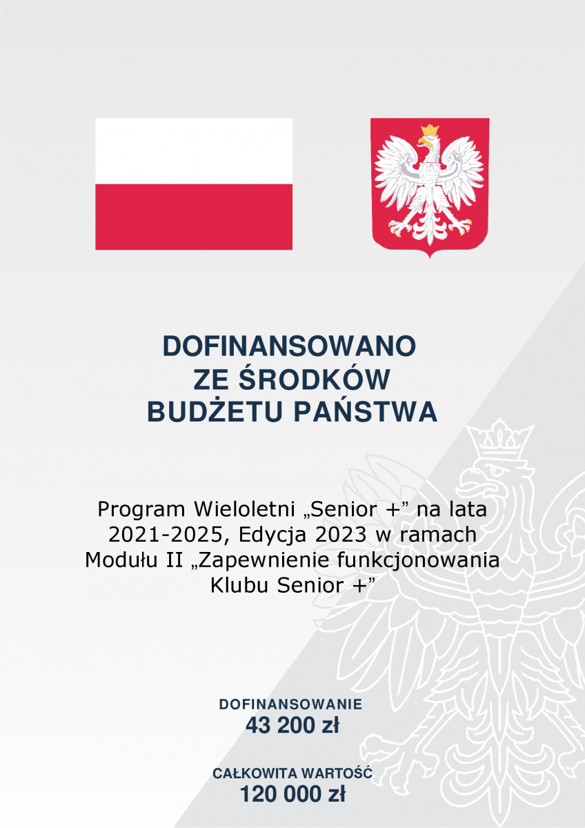 Dotacja jest przeznaczona na dofinansowanie zadania polegającego na zapewnieniu funkcjonowania ośrodka wsparcia dla osób starszych w zakresie ustalonym w programie wieloletnim „Senior +” na lata 2021-2025, Edycja 2023 w ramach Modułu II „Zapewnienie funkcjonowania Klubu Senior +”.